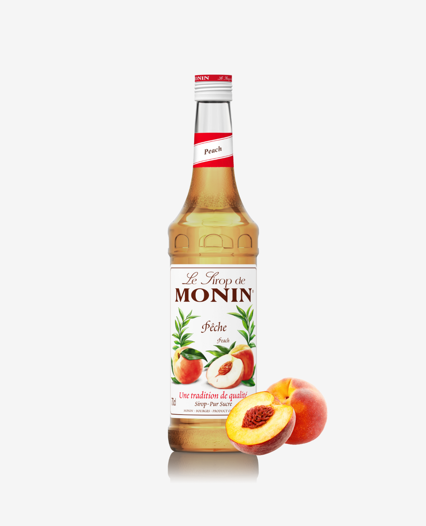 Syrop Monin Peach charakteryzuje się mętną barwą z różowymi przebłyskami oraz słodkim smakiem soczystej brzoskwini. Monin Peach doskonale sprawdzi się jako dodatek do herbat, zimnych napojów oraz koktajli.